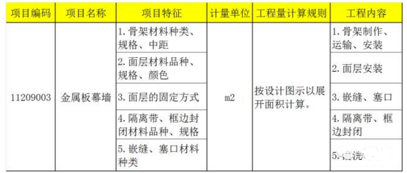 金属板幕墙计算规则应与玻璃幕墙加以区别,增加金属板幕墙清单。清单设置详见下表。
