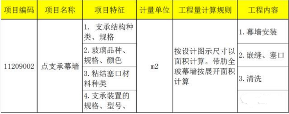 点支承幕墙的清单的补充需根据现行幕墙规范进行补充,项目特征需对点支承幕墙的支承结构的形式、支承装置规格型号进行描述,补充清单详见下表。