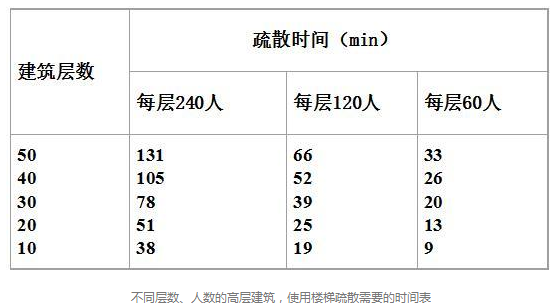 从表中的数字可以看出,疏散时间可以减少1/2。即使这样,当层数在三十层以上时,要将人员在尽短的时间里疏散到室外,仍然是不容易的事情。