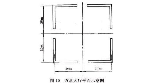 按正方形大厅来确定中心点到四个出口的距离都能达到30m,这个厅的最大面积是60m60m=3600㎡。与放宽的商业营业厅、展览厅的防火分区面积相一致