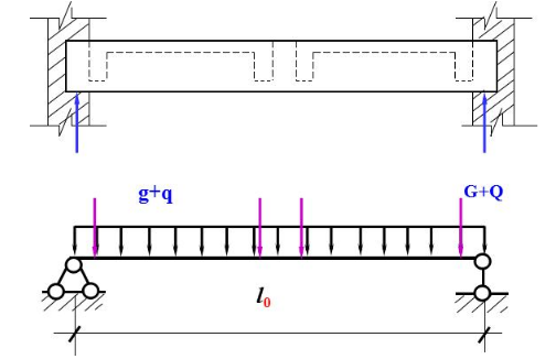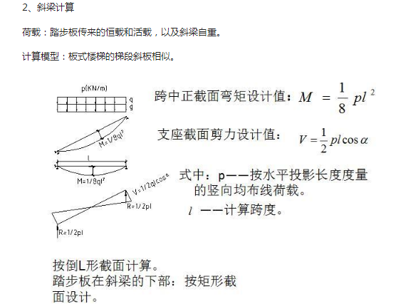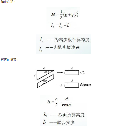 计算模型:踏步板两端支承在斜梁上,按两端简支的单向板进行计算。取一个踏步为计算单元。其截面为梯形,可按截面面积相等的原则,等效为同宽度的矩形截面。