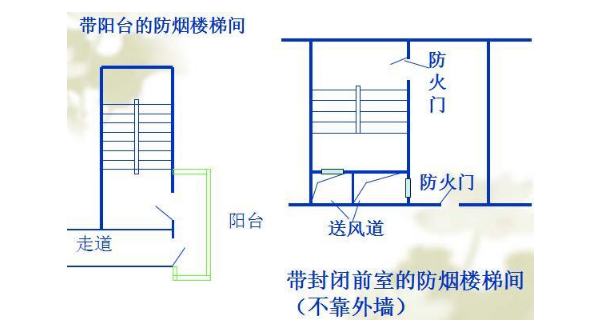 其形式一般有带封闭前室或合用前室的防烟楼梯间,用阳台作前室的防烟楼梯间,用凹廊作前室的防烟楼梯间等。
