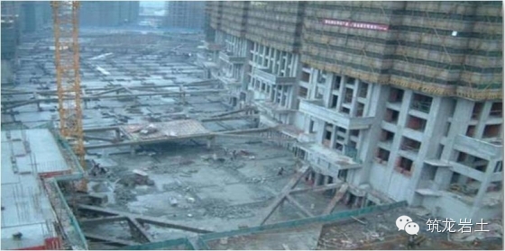 随着地下空间的开发利用,基坑越来越深,对设计理论与施工技术都提出的更难的要求。如无锡恒隆广场基坑深近27m,上海中心深基坑达30m,均已挖入了承压水层。右图为宁波嘉和中心二期项目基坑,平均开挖深度为18.3m,最大挖深为25.9m,整体为三层地下室布局,局部有夹层。