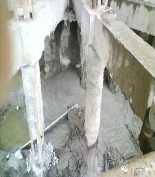 图为2008年杭州地铁深基坑施工中地下连续墙折断破坏