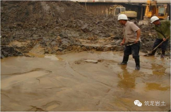 由于对承压水的降水不当,在隔水层中开挖基坑时,当基底以下承压含水层的水头压力冲破基坑底部土层,将导致坑底突涌破坏。下图为上海某深基坑坑底内发生承压水突涌。