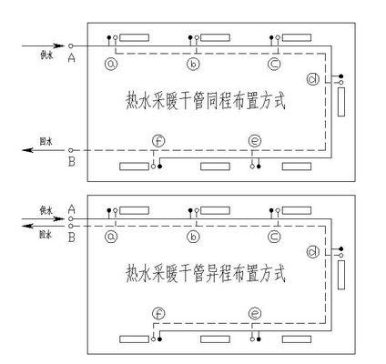 在热水采暖系统中,不论你采用哪种分类方式,均可根据供水和回水的水流方向而布臵成同程和异程系统(详见附图)。