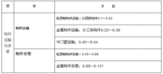 1)第六章由构件的运输与安装两部分组成,运输部分包括砼构件、金属构件和木门窗运输;安装部分包括预制构件和金属构件安装。