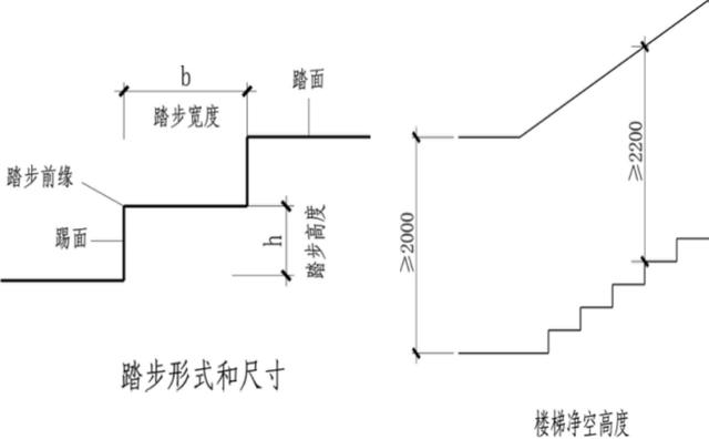 楼梯的坡度由踏步高h(踢面)与踏步宽b(踏面)来控制,常用坡度30左右。b、h符合下式:b+h=450mm。