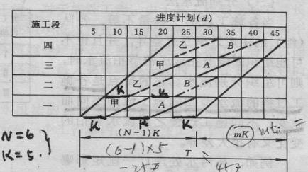 特征:某一施工过程在各施工段的耗时相同,即t1=t2=ti ; 某一施工段各施工过程在该段所花费时间相同并等于流水步距,即ti=ti+1=k