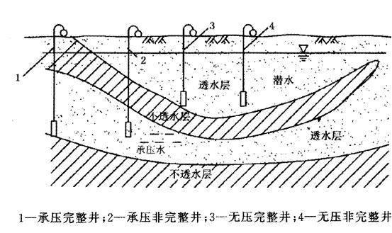 a)按照滤管与不透水层的关系:完整井―到不透水层;非完整井―未到不透水层。