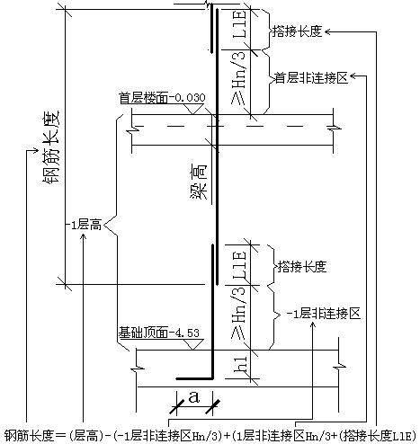 纵筋长度=-1层层高1层非连接区Hn/3+1层非连接区Hn/3+搭接长度LlE