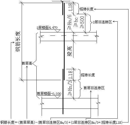纵筋长度=首层层高-首层非连接区Hn/3+max(Hn/6,hc,500)+搭接长度LlE