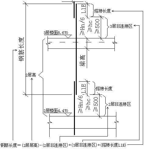 纵筋长度=中间层层高-当前层非连接区+(当前层+1)非连接区+搭接长度LlE