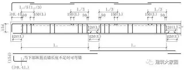 ④梁下部肋形钢筋锚长为12d;当为光面钢筋时,其锚长为15d。