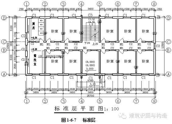 本建筑平面图分底层平面图(如图1-6-6)、标准层平面图(如图1-6-7)及屋顶平面图(如图1-6-8)。从图中可知比例均为1:100,从图名可知是哪一层平面图。从底层平面图的指北针可知该建筑物朝向为坐北朝南;同时可以看出,该建筑为一字形对称布置,主要房间为卧室,内墙厚240mm,外墙厚370mm。本建筑设有一间门厅,一个楼梯间,中间有1.8宽的内走廊,每层有一间厕所,一间盥洗室。有两种门,三种类型的窗。房屋开间为3.6米,进深为5.1米。从屋顶平面图可知,本建筑屋顶是坡度为3%的平屋顶,两坡排水,南、北向设有宽为600 mm的外檐沟,分别布置有3根落水管,非上人屋面。剖面图的剖切位置在楼梯间处。