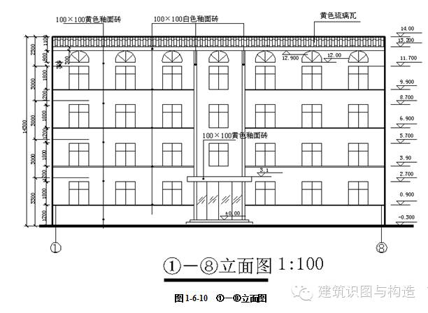 如图1-6-10所示,本建筑立面图的图名为①-⑧立面图,比例为1:100,两端的定位轴线编号分别为①、⑧轴;室内外高差为0.3米,层高3米,共有四层,窗台高0.9米;在建筑的主要出入口处设有一悬挑雨篷,有一个二级台阶,该立面外形规则,立面造型简单,外墙采用100100黄色釉面瓷砖饰面,窗台线条用100100白色釉面瓷砖点缀,金黄色琉璃瓦檐口;中间用墙垛形成竖向线条划分,使建筑给人一种高耸感。
