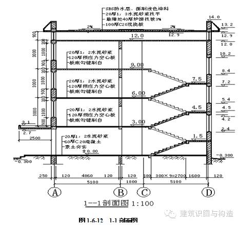 3.根据剖面图尺寸及标高,了解建筑层高、总高、层数及房屋室内外地面高差。如图1-6-12所示,本建筑层高3m,总高14 m,4层,房屋室内外地面高差0.3m。