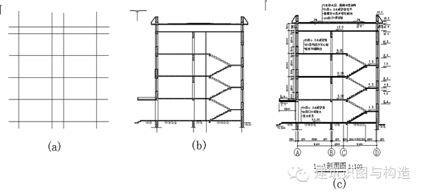 1.结合底层平面图阅读,对应剖面图与平面图的相互关系,建立起建筑内部的空间概念。