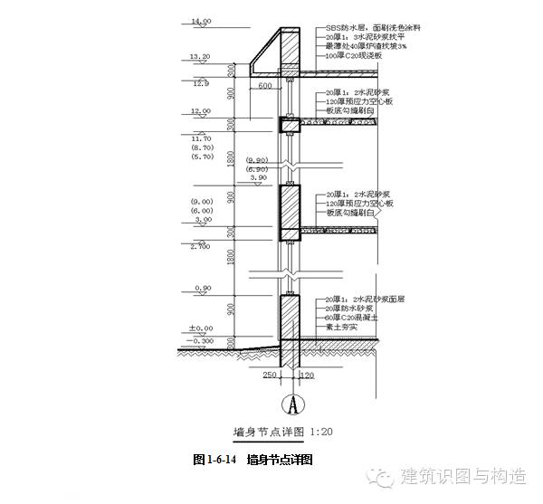 墙身详图也叫墙身大样图,实际上是建筑剖面图的有关部位的局部放大图。它主要表达墙身与地面、楼面、屋面的构造连接情况以及檐口、门窗顶、窗台、勒脚、防潮层、散水、明沟的尺寸、材料、做法等构造情况,是砌墙、室内外装修、门窗安装、编制施工预算以及材料估算等的重要依据。有时在外墙详图上引出分层构造,注明楼地面、屋顶等的构造情况,而在建筑剖面图中省略不标。