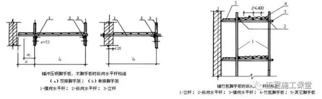 单排设置时,横向杆的一头搁入墙内不少于240mm,另一头用扣件与立杆连接,至少伸出100mm;当为双排设置时,横向杆端头离墙距离为50~100mm。