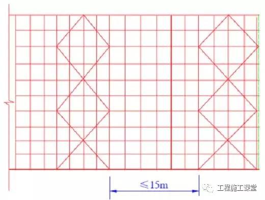 高度在24m以下的单双排脚手架,均必须在外侧立面的两端各设置一道剪刀撑,并应由底到顶连续设置;中间各道剪刀撑之间的净距不应大于15m;
