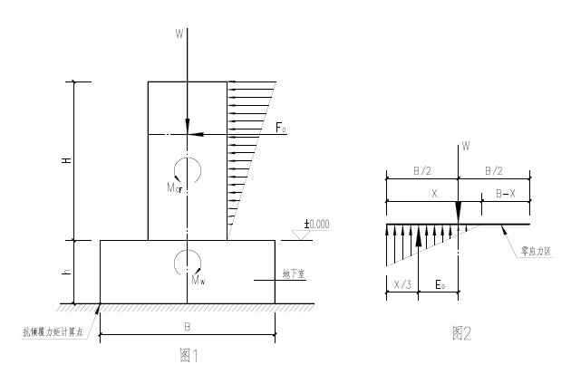 从上表可以看出,对于高宽比>4的高层建筑,抗倾覆安全系数3时,基底不出现零应力区;高宽比不大于4的高层建筑,抗倾覆安全系数2.308时,零应力区面积比就不会超过15%;如果抗倾覆安全系数不满足要求,则可将弯矩作用方向的基础宽度加宽,直到满足为止;