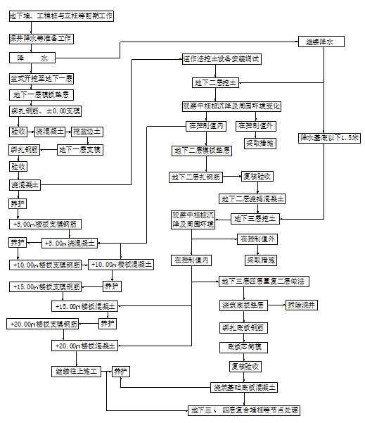 岩土力学的计算与实际相差很大,因此保证结构安全是信息化施工的重要任务。对地下墙、立柱桩、垂直与水平变形、地下水位、挖土工况条件等要全面进行监测,根据实测结果再按实际工况来反算土体力学参数,修正下一步工况计算,当出现相邻柱间沉降差超过报警值,可以采取停止上部结构施工、局部放慢或加速挖土,个别地方可采取注浆加固等措施。实践证明,动态控制可以保证沉降差在一定范围之内的要求。