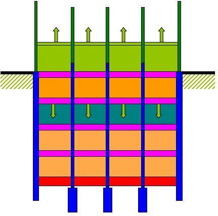 在上海深基坑施工必须降水,而逆作法施工降水更加重要,在降水后,上海软土地基土性指标大大提高,不仅能提高人员与机具在地下施工的安全与效率,而且地下室楼板支模也必须降水,所以挖土以前要安排足够的井点抽水。逆作法施工用深井点,其位置要事先设计,认真实施,不能与结构梁相交,以避免给结构施工带来麻烦。深井降水要动态控制,水位要定时观测,应始终让水位控制在挖土面以下1.5m左右。