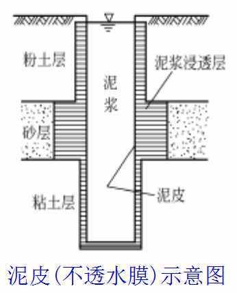 (1)防止槽壁坍塌:泥浆从槽壁表面向土层内渗透到一定范围就粘附在土颗粒上,在槽壁上形成的泥皮(不透水膜),使得泥浆的静水压力有效地作用在槽壁上,防止槽壁的剥落和坍塌,如右图所示。