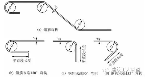 II、III 级钢筋(变形钢筋)一般可以不作弯钩,如设计需要时末端只作90或135弯折,II 级钢筋的弯曲直径不宜小于钢筋直径d 的4 倍,III 级钢筋不宜小于钢筋直径d的5倍,平直部分长度应按设计要求确定,如下图(c)所示。