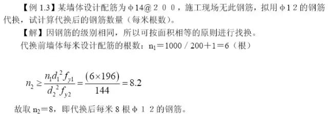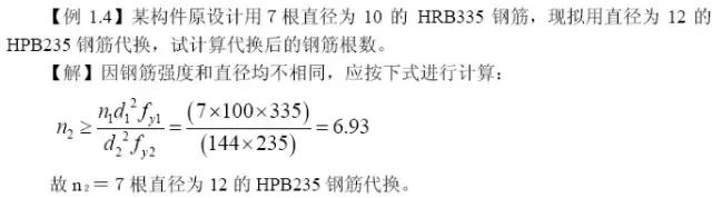 当结构构件按裂缝宽度或抗裂性要求控制时,钢筋的代换需进行裂缝及抗裂性验算。钢筋代换后,有时由于受力钢筋直径加大或根数增多而需要增加排数,则构件截面的有效高度h0减小,截面强度降低,此时需复核截面强度。