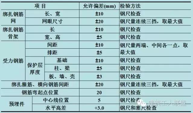 安装钢筋时,配置的钢筋品种、级别、规格和数量必须符合设计图纸的要求。钢筋安置位置的偏差应符合下表的规定。