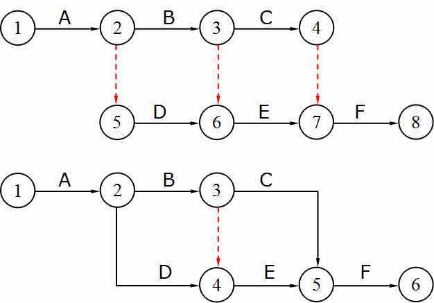 同一个网络图中,只允许一个起节点和一个终点节点,不允许出现没有紧前工作的尾部节点或没有紧后工作的尽头节点。