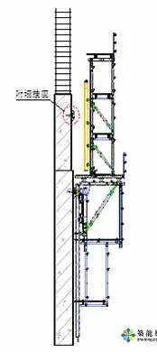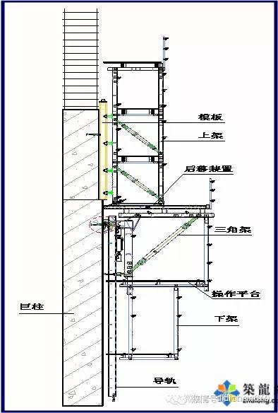 3、顶模的爬升步距需与塔吊协调一致,并尽可能方便施工。