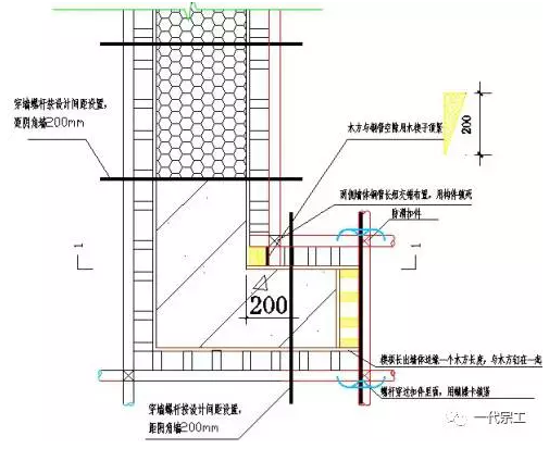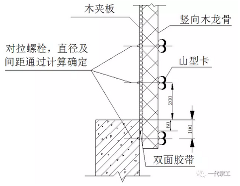 结构露面的混凝土墙体顶部侧面100mm处预留对拉螺栓,间距不大于500mm,混凝土浇筑成型后,侧面接缝处下部贴3mm厚15mm宽的双面胶带;模板下挂100mm(赔模式要考虑下挂长度),保证接缝处模板与混凝土充分搭接;预埋对拉螺栓杆处加设水平双钢管背楞,竖向木方背楞安装长度要超过预埋对拉螺栓杆中心150mm;上层第一道对拉螺栓杆中心应设置在距地面结构标高200mm的位置,其余四道对拉螺栓杆根据模板展开图依次设置。