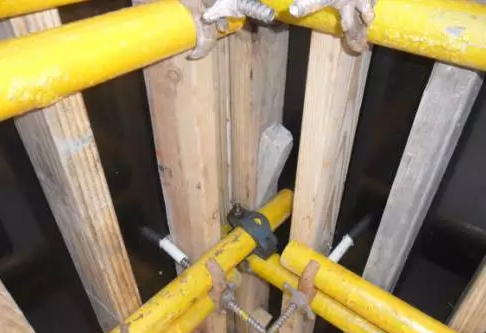 长边模板伸出一个木方长度,放一根木方钉一起,这样横向可以用钢管加固,这样解决了因为加固引起的截面变形,拼缝漏浆。