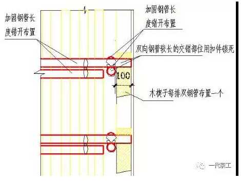 双排钢管长短错开200MM。双向钢管十字相交扣件锁死,阴角处 2根木方横放,十字交错钢管加固阴角处木方,空隙用木楔子顶严。