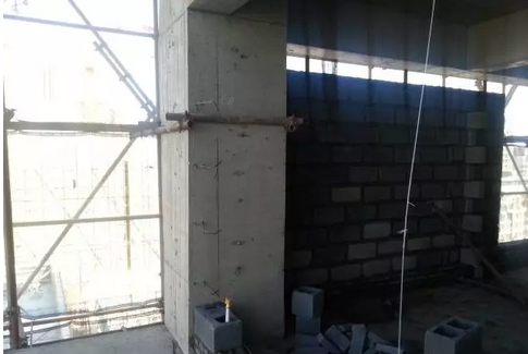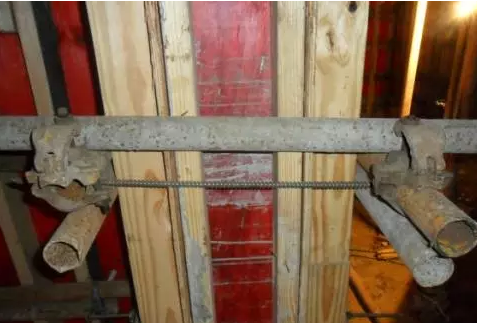 3)模板涂刷脱模剂后,定尺模板合模,如框架柱钢筋有尺寸偏差,模板不会合拢,需提前进行,钢筋的调整,不要强行挤压模板,造成模板面层破损,会对表观质量造成影响。
