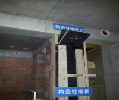 根据施工图纸对砌体工程的构造柱进行深化设计,确定构造柱的位置与截面形状;构造柱位置处植筋并绑扎钢筋,注意箍筋抗震加密区的间距;砌筑马牙槎根据砌筑边线先退后进,退进尺寸为60mm,马牙槎的高度不超过300mm,上下垂直;马牙槎贴双面胶带,模板用对拉螺栓固定每排两根,保证墙体不漏浆;模板支设高度一次到顶,在便于浇筑的一侧设置喇叭口;混凝土浇筑时一次到位,与梁底密室不留缝隙,拆模后将喇叭口剔除。