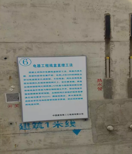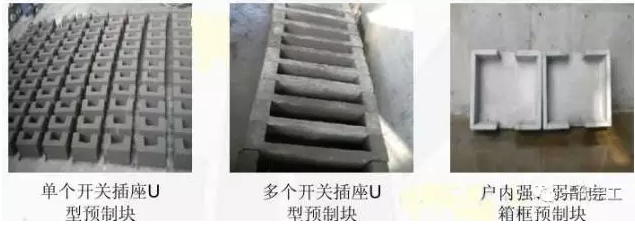 电器开关、电箱采用混凝土预制块预埋处理,提前将开关预埋到符合墙体砌块模数的混凝土预制块中,包括接开关盒的线管,线管长出混凝土模块150mm。然后砌筑时把砌块底部钻孔把线管连接到梁下线管接头。