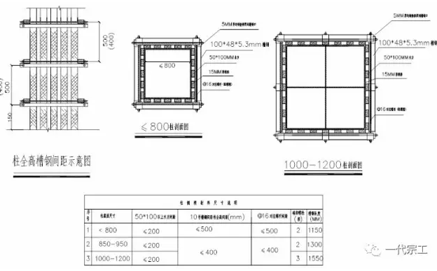 5)槽钢加固时,按柱子大小确定好对应的型号的槽钢,从柱子根部150MM 起开始加固,柱箍:小于800采用单肢10#槽钢,柱全高间距500mm。850-950采用单肢10#槽钢,柱全高间距400mm。1000-1200采用单肢10#槽钢,柱全高间距400mm.柱中间加设穿墙螺杆一道。