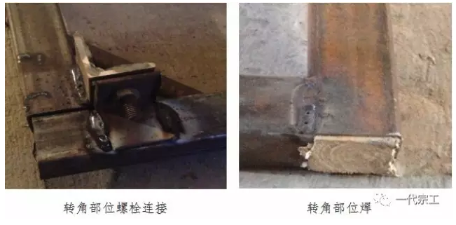 相邻方钢在接头节点部位通过∟50503mm角钢连接,距离方钢边缘50mm焊接角钢,角钢上部使用钻机打孔,采用M10螺栓固定相邻方钢。部分接头节点处方钢采用焊接(如若转角部位全部采用焊接,轮廓较大,不方便搬运,不易拆除,见下图),方钢端部木方填塞封闭。