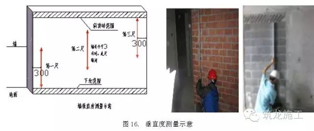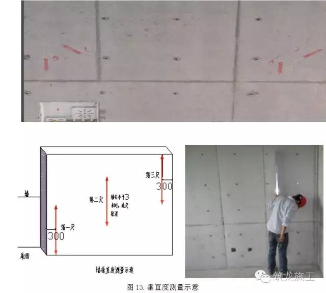 每道剪力墙取任意一面,在控制线上架设扫平仪,沿竖向离墙边30cm分别取三个点(在墙长的情况下需要在墙中间也取点),量取距离并记录下来比较,三个点差值即为垂直度,允许误差6mm。