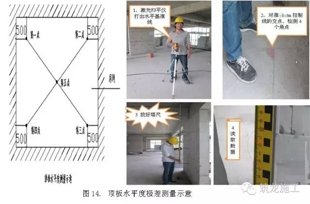 使用激光扫平仪,在实测板跨内打出一条水平基准线。同一实测区距顶板天花线约50cm处位置选取4个角点,以及板跨几何中心位(若板单侧跨度较大可在中心部位墙加1个测点),分别测量混凝土顶板与水平基准线之间的5个垂直距离。以最低点为基准点,计算别外四点与最低点之间的偏差。偏差值15mm时实测点合格。