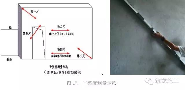 当墙面长度小于3m,在同一墙面顶部和根部4个角中,选取左上、右下2个角按45角斜放靠尺分别测量1次,在距离地面20cm左右的位置水平测1次(墙长大于3m,在墙长度中间位置增加一次水平测量)。有门窗、过道洞口的,增加在各洞口45度斜测一次。合格标准 [0,4]mm。