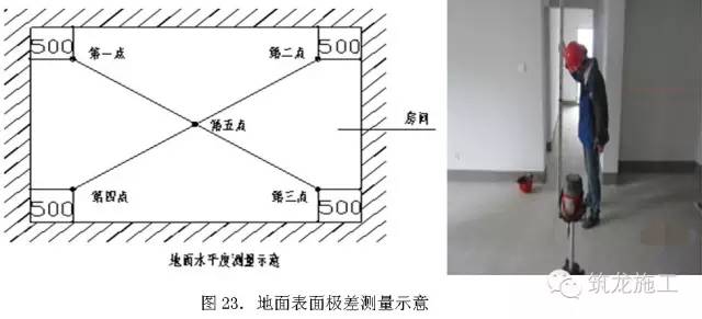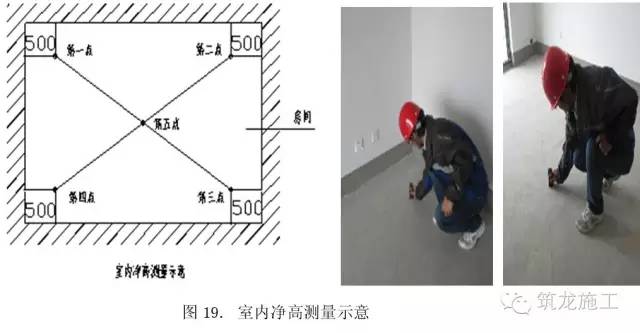 各房间地面的4个角部区域,距地脚边线50cm附近各选取1点(避开吊顶位),在地面几何中心位选取1点,测量出找平层地面与天花顶板间的5个垂直距离,即当前施工阶段5个室内净高实测值。比较实测值与设计值的偏差,合格标准为:初装修:[-15㎜,极差20㎜];精装修:[-10㎜,极差15㎜]。