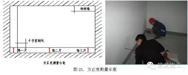 在同一测区内,实测前需用5m卷尺或激光扫平仪对弹出的两条方正度控制线,以短边墙为基准进行校核,无误后采用激光扫平仪打出十字线或吊线方式,沿长边墙方向分别测量3个位置(两端和中间)与控制线之间的距离(如果现场找不到控制线,可以一面带窗墙面为基准,用仪器引出两条辅助方正控制线)。选取3个实测值之间的极差,合格标准[0,12]mm。