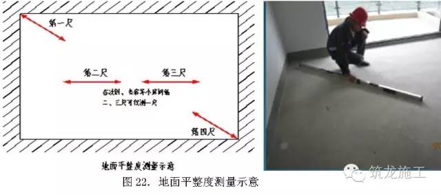 房间地面的2个对角区域,按与墙面夹角45平放靠尺测量2次,加上房间中部区域测量一次,共测量3次。客、餐厅或较大房间地面的中部区域需加测1次。合格标准[0,4]mm。