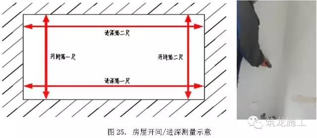 按开间(进深)方向用测距仪测量墙体两端的距离,各得到两个实测值,比较两个实测值与图纸设计尺寸以及比较两个实测值之间的极差,找出偏差的最大值,其小于等于15mm,并且极差小于等于20㎜时合格;最大偏差值大于15mm或者极差大于20㎜时不合格。