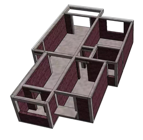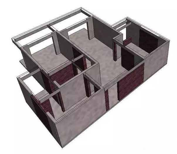 这是刚刚例子的3d立体图,从图上可以看到,灰色的墙,梁都是属于不可以拆的混凝土承重墙体,而红色的砌块墙体才可以改动或拆除。而且在改动时必须要注意,千万不能把混凝土连梁也一并拆掉,这样会使承重失去平衡,后果会很严重。